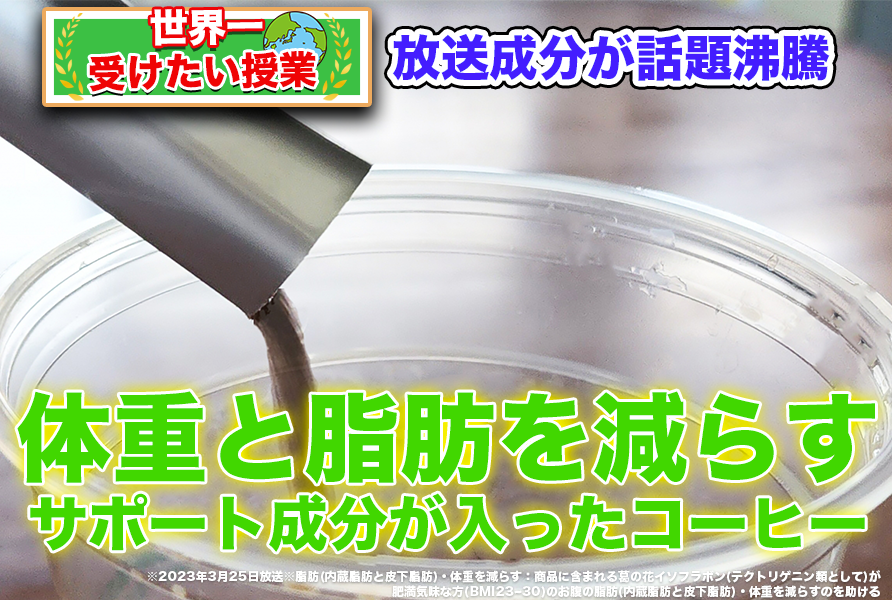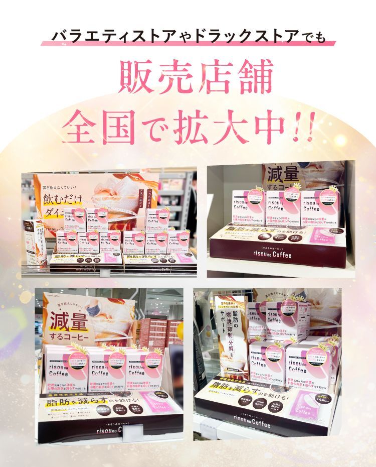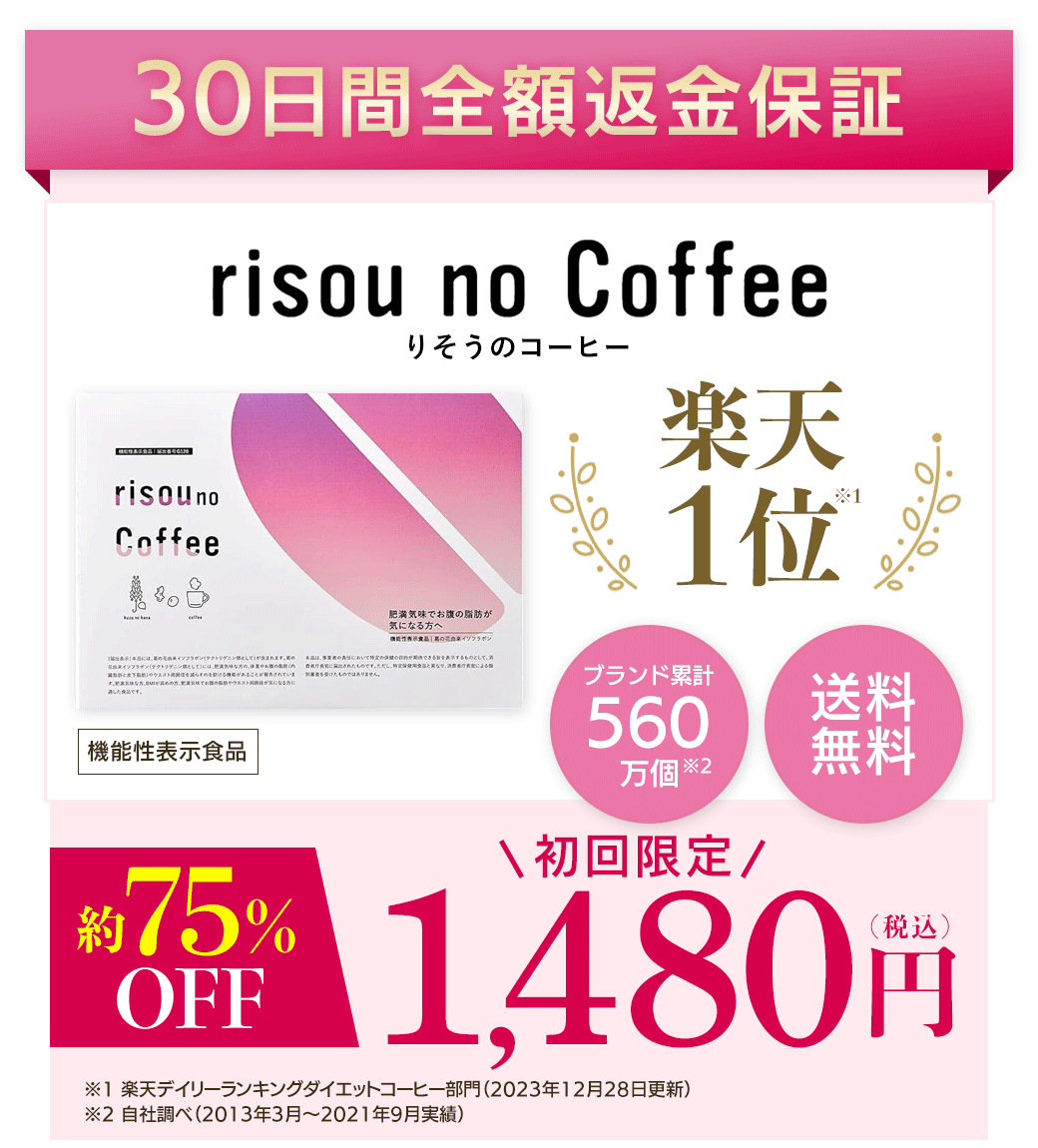 ※1:脂肪(内蔵脂肪と皮下脂肪)・体重を減らす:商品に含まれる葛の花イソフラボン(テクトリゲニン類として)が、肥満気味な方(BMI23~30)のお腹の脂肪(内蔵脂肪と皮下脂肪)・体重を減らすのを助ける※2:※調査内容:2024年4月6日~2024年4月10日に実施されたrisou no Coffee定期コース継続者及び購入回数6回以上(2024/04/06時点)向けのアンケートと、2024年6月7日~6月10日に実施されたグループ会社内のアンケート結果の合算によるもの(N=200)